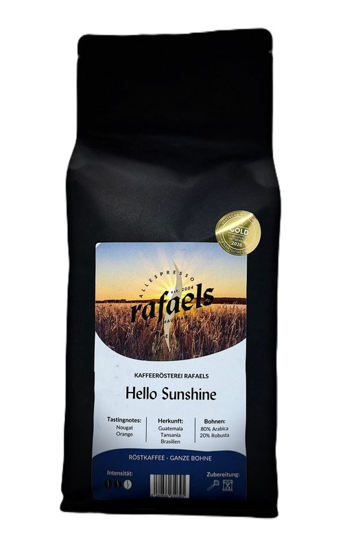 Unser Espresso Hello Sunshine- frech&jung - leichter hocharomatischer Espresso, runder Körper, mittlere Crema- Tansania meets Guatemala. Gewinner der Goldmedaille 2021 in der Kategorie "Espresso" der Deutschen Röstergilde